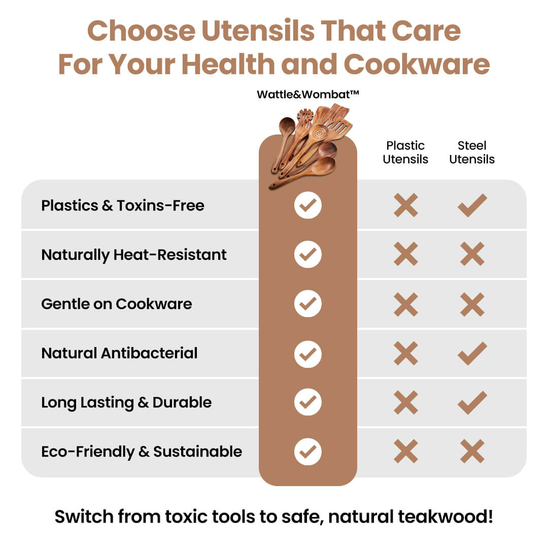 With the TeakWood 9™, you get a premium set of utensils handcrafted from solid teak with no chemicals, no toxins, no microplastics