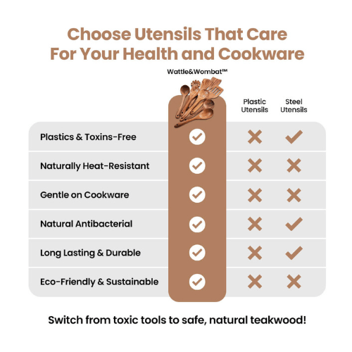 At Wattle&Wombat™, our mission is to make every kitchen safer, cleaner, and more beautiful, with carefully designed, high-quality teakwood utensils Australians trust