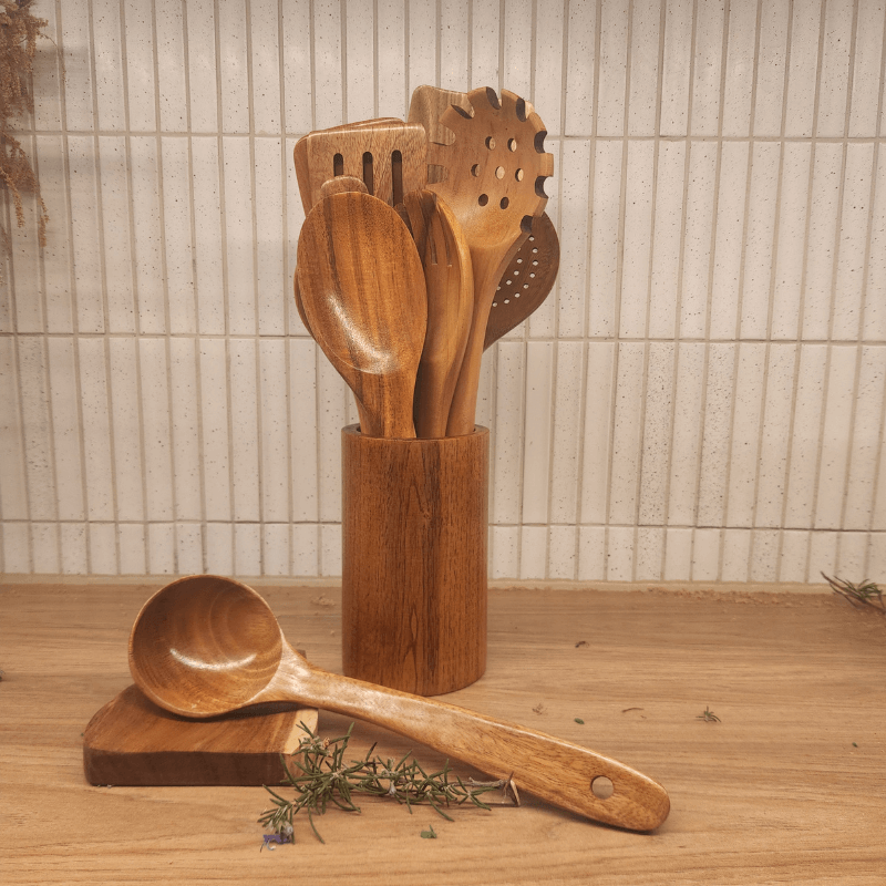 Complete the 9-Piece Set with the matching Teak Spoon Rest and Utensil Holder, both handcrafted and perfect for stylish bench-top storage and display.