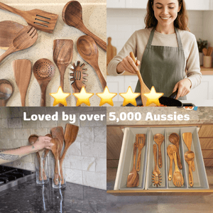 The 24-piece Wattle & Wombat™ Teak Gift Bundle gives you 2x 9-piece Premium Teakwood Sets and 2x Signature Utensil Holders & Spoon Rests and 2x Premium Acacia Tongs. Durable, natural, and completely free from microplastics, it’s the ultimate non-toxic, sustainable solution for your home and a meaningful gift for someone you love. 🌿